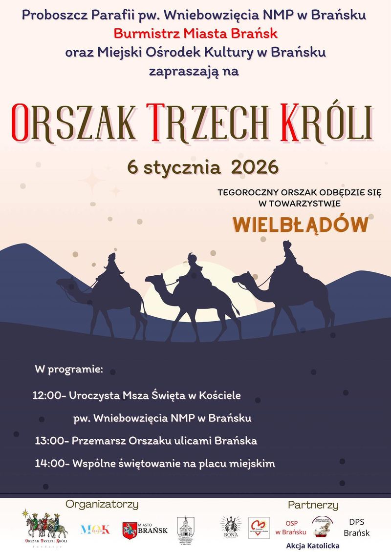 Po raz kolejny ulicami Brańska przejdzie Orszak Trzech Króli. Wszyscy mieszkańcy i goście zaproszeni są do wspólnego świętowania Objawienia Pańskiego. W tym roku brański Orszak odbędzie się w wyjątkowej oprawie, bo w towarzystwie wielbłądów.