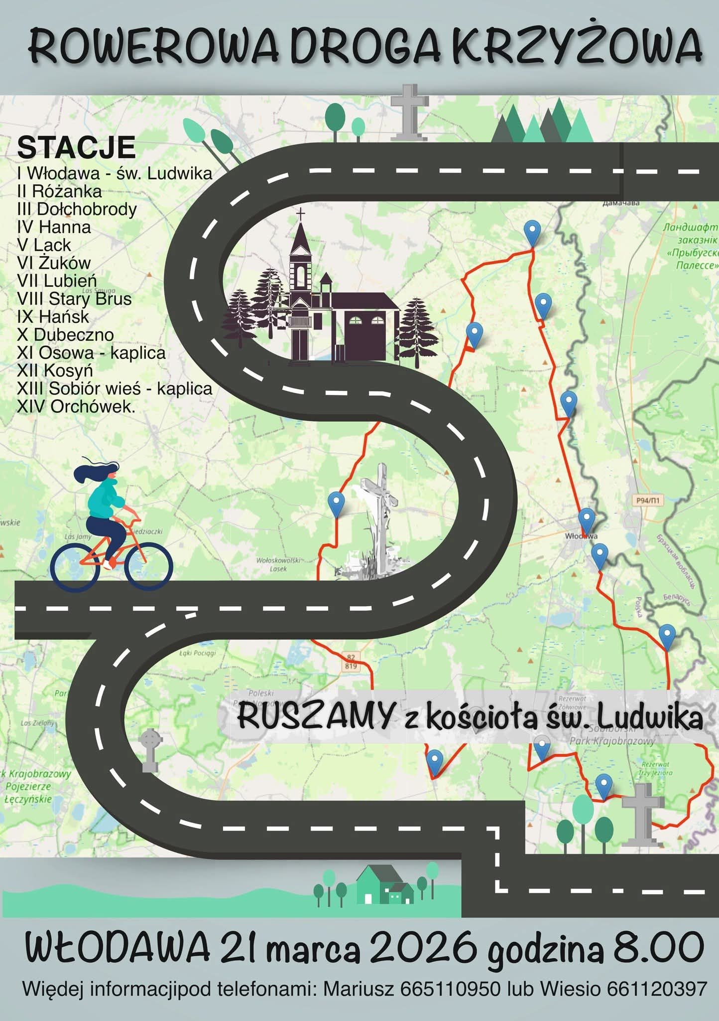 Wydarzenie, które zaplanowane jest na sobotę, 21 marca, rozpocznie się o godz. 8.00 przy kościele św. Ludwika we Włodawie. Uczestnicy wyruszą stamtąd na trasę prowadzącą przez kościoły położone na obrzeżach regionu. Każdy z przystanków będzie okazją do krótkiej modlitwy i rozważań kolejnych stacji Drogi Krzyżowej. Rowerowa Droga Krzyżowa to propozycja dla wszystkich, którzy chcą przeżyć Wielki Post w sposób aktywny, a jednocześnie pogłębić swoją duchowość. Połączenie modlitwy z wysiłkiem fizycznym sprzyja, wyciszeniu i budowaniu wspólnoty między uczestnikami.Trasa wydarzenia została zaplanowana tak, aby prowadziła wzdłuż granic powiatu włodawskiego, odwiedzając świątynie znajdujące się na jego krańcach. Finał pielgrzymki zaplanowano w Sanktuarium Matki Bożej Pocieszenia w Orchówku.