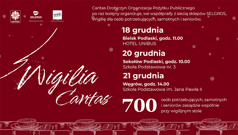 Caritas Drohiczyn Organizacja Pożytku Publicznego po raz kolejny organizuje wigilię dla osób potrzebujących, samotnych i seniorów . To wyraz solidarności, troski i wspólnoty w wyjątkowym czasie Świąt Bożego Narodzenia. Spotkaniom tym patronuje Katolickie Radio Podlasie oraz portal Podlasie24.