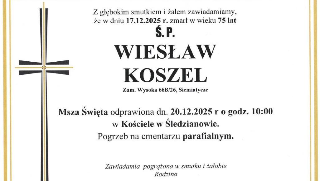 Region Siemiatycze Bielsk Podlaski Drohiczyn Pt. 19.12.2025 07:09:35 Zmarł Wiesław Koszel – kapelmistrz, społecznik, człowiek muzyki