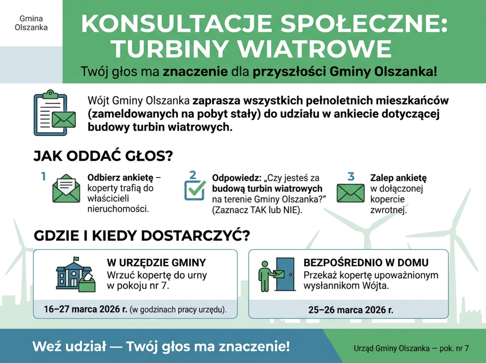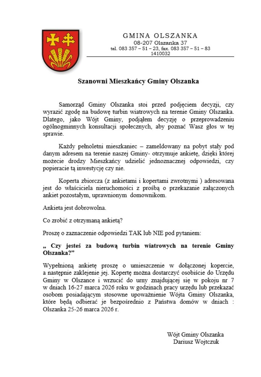 Do mieszkańców gminy Olszanka trafiły ankiety oraz karty informacyjne dotyczące planowanej budowy turbin wiatrowych produkujących energię elektryczną. Jak informuje wójt gminy Olszanka Dariusz Wojtczuk, samorząd chce w ten sposób poznać opinię lokalnej społeczności na temat ewentualnej realizacji inwestycji.W konsultacjach mogą wziąć udział wszyscy pełnoletni mieszkańcy gminy zameldowani na pobyt stały. W ankiecie należy odpowiedzieć na pytanie: „Czy jesteś za budową turbin wiatrowych na terenie gminy Olszanka?”, zaznaczając odpowiedź „tak” lub „nie”.