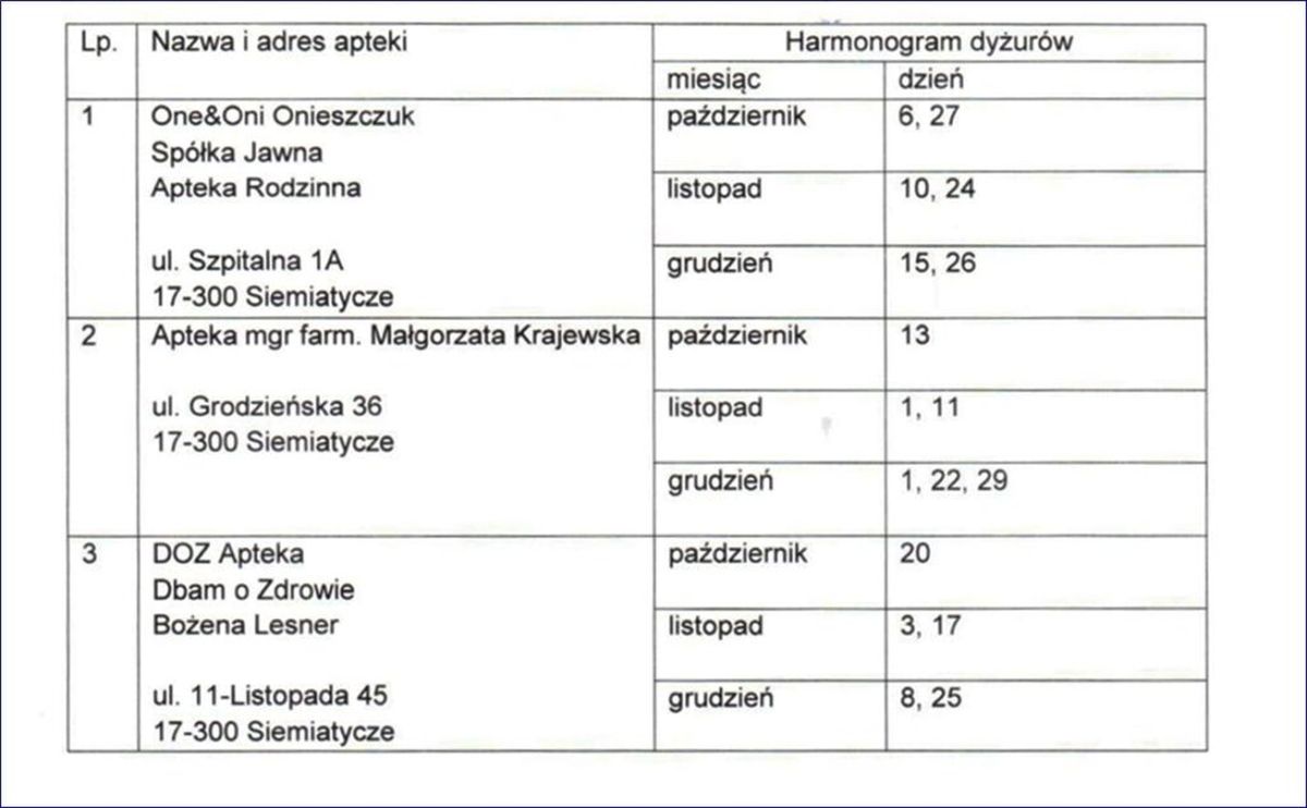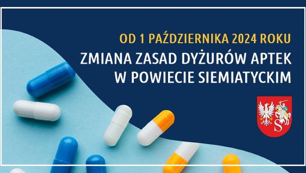 Powiat siemiatycki informując o zmianie wyjaśnia: „Tak znacząca zmiana podyktowana jest wprowadzonymi radykalnymi zmianami przepisów zawartymi w ustawie Prawo Farmaceutyczne, a będącymi pokłosiem nowelizacji ustawy o refundacji leków, środków spożywczych specjalnego przeznaczenia żywieniowego oraz wyrobów medycznych uchwalonej 17 sierpnia 2023 roku przez Posłów RP poprzedniej – IX kadencji Sejmu (2019-2023) i podpisanej przez Prezydenta RP Andrzeja Dudę.”Zgodnie z Uchwałą nr 15/67/24 Zarządu Powiatu Siemiatyckiego z dnia 24 września (br.) na terenie powiatu siemiatyckiego od 1 października do 31 grudnia 2024 r. dyżury aptek w dni wolne od pracy (niedziele i święta) pełnione będą rotacyjnie przez 3 apteki w godz. 14.00 – 21.00.