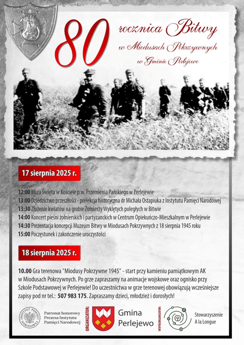 Organizatorzy zapraszają wszystkich mieszkańców oraz gości do wspólnego uczczenia 80. rocznicy Bitwy w Miodusach Pokrzywnych.