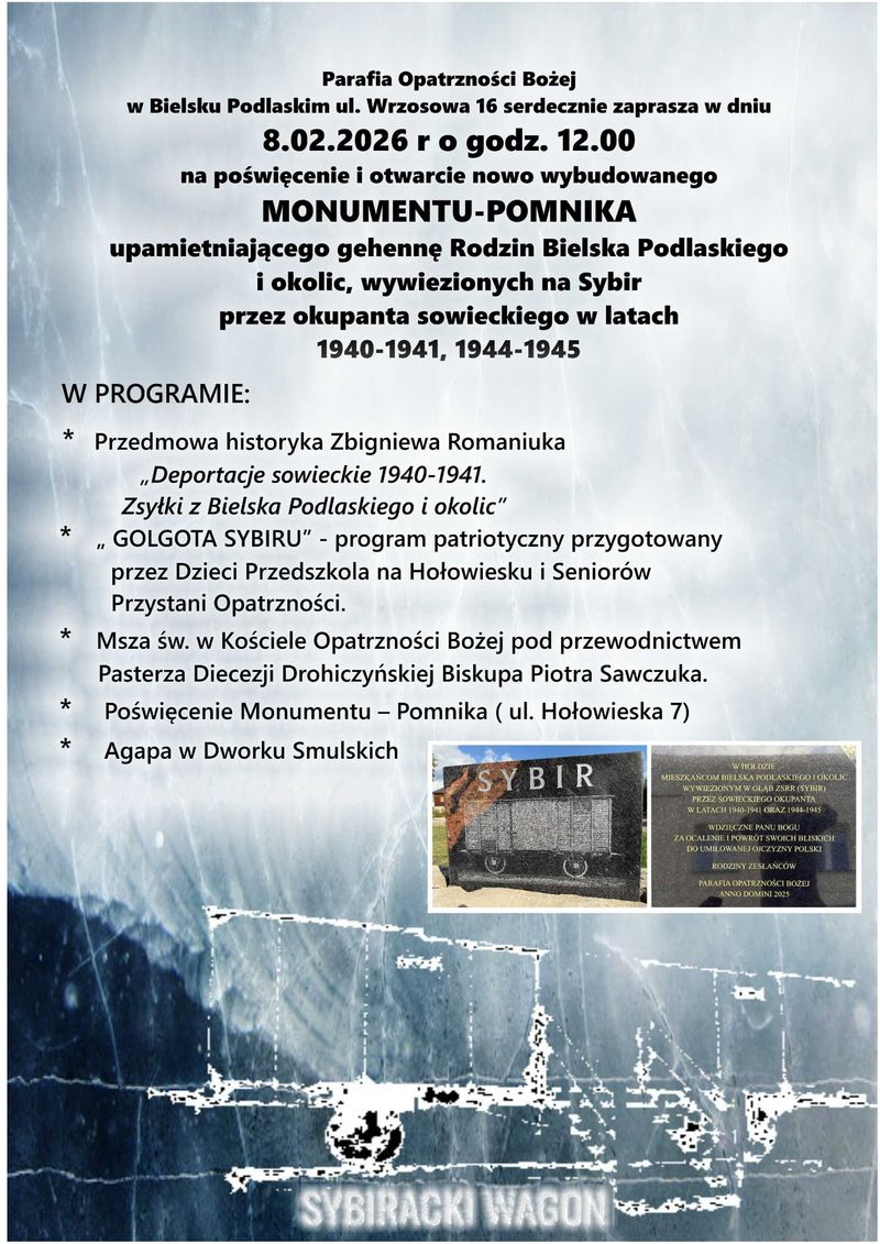 W Bielsku Podlaskim dobiega końca inicjatywa, która poruszyła wielu mieszkańców regionu i stała się ważnym gestem pamięci o ofiarach sowieckich deportacji. W niedzielę, 8 lutego, o godz. 12:00 odbędzie się uroczyste poświęcenie i otwarcie nowo wybudowanego monumentu–pomnika upamiętniającego gehennę rodzin z Bielska Podlaskiego i okolic, wywiezionych na Sybir w latach 1940–1941 oraz 1944–1945.