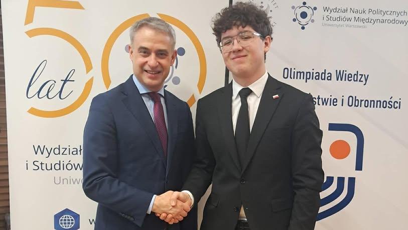 To osiągnięcie jest efektem nie tylko talentu, ale przede wszystkim systematycznej pracy i pasji do zgłębiania zagadnień związanych z funkcjonowaniem państwa oraz współczesnymi wyzwaniami w zakresie bezpieczeństwa. Olimpiada o Bezpieczeństwie i Obronności należy do najbardziej wymagających konkursów wiedzy w Polsce i obejmuje szeroki zakres tematyczny. Tegoroczna edycja została poświęcona cyberbezpieczeństwu w Polsce i współczesnym świecie. W trakcie konkursu sprawdzana była nie tylko znajomość systemu bezpieczeństwa państwa czy relacji międzynarodowych, ale także umiejętność analizowania zjawisk, które kształtują współczesny świat.Finałowy etap konkursu odbył się w sobotę, 14 marca, na Uniwersytecie Warszawskim i zgromadził 150 najlepszych uczniów z całej Polski, wyłonionych w wieloetapowych eliminacjach szkolnych oraz okręgowych. W tym elitarnym gronie Mateusz Borówka udowodnił, że należy do ścisłej krajowej czołówki młodych specjalistów w dziedzinie bezpieczeństwa. Trzecioklasista gratulacje odebrał od Wiceprezesa Rady Ministrów i Ministra Cyfryzacji, Krzysztofa Gawkowskiego. Zwycięzcą jubileuszowej olimpiady został Bartłomiej Słyś, zdobywając 230 punktów.